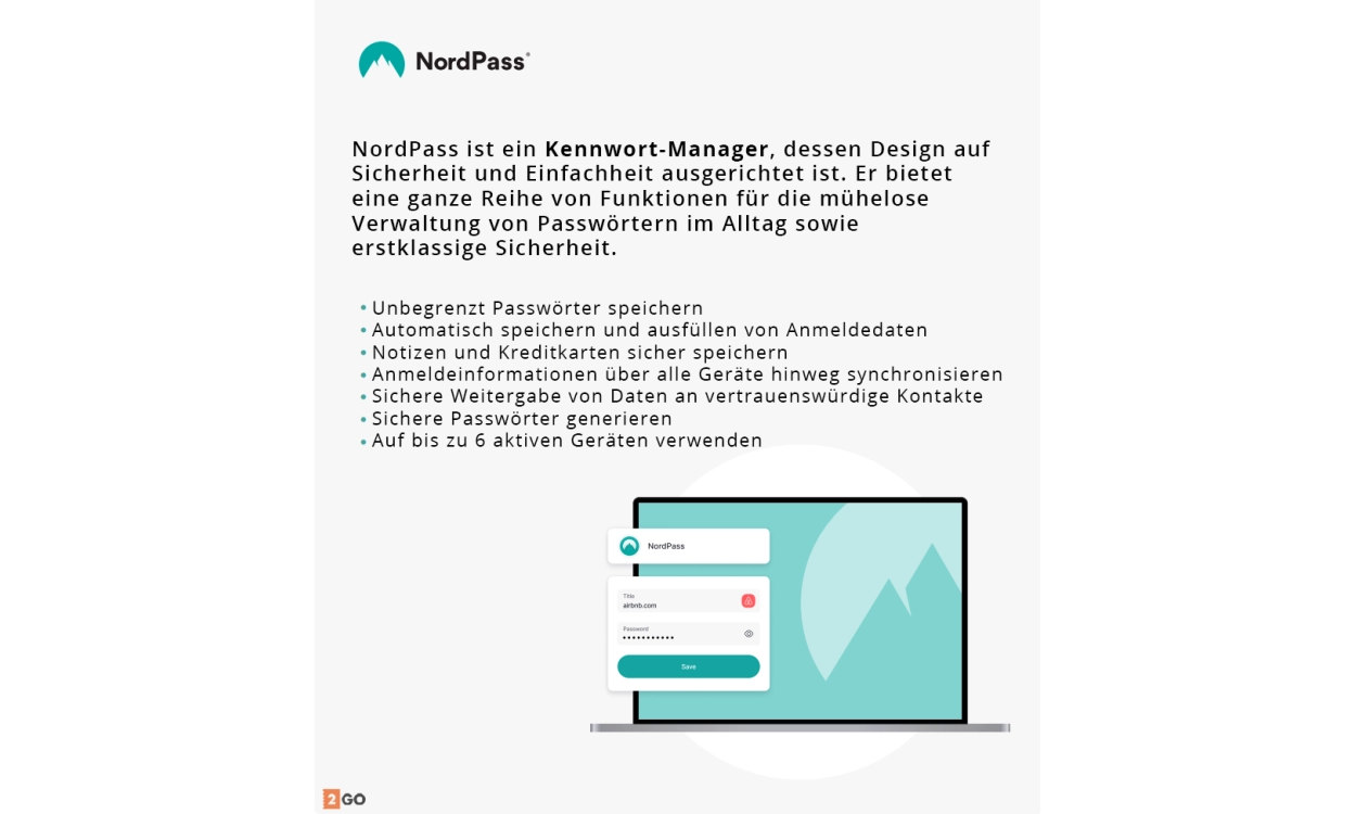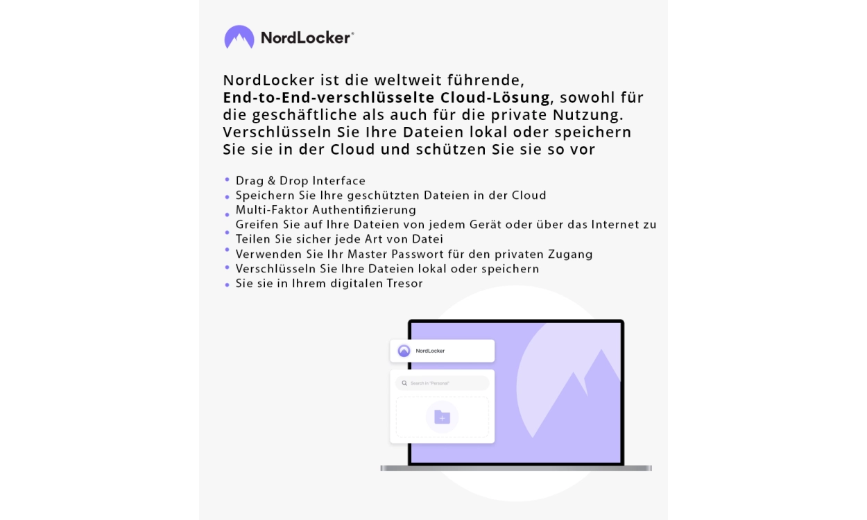 Sichere Speicherung und Passwortverwaltung: Mit NordLocker erhältst du 1000 GB Cloud-Speicher inklusive automatischer Verschlüsselung – sogar Dateinamen sind verborgen. Und mit NordPass verwaltest du deine Passwörter sicher und erhältst sofortige Meldungen bei Datenlecks.