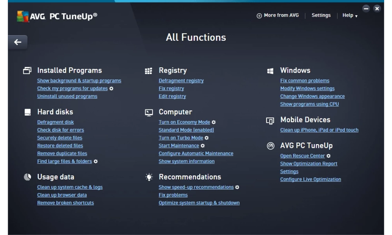 AVG TuneUp biedt krachtige functies zoals het verwijderen van onnodige bestanden, het oplossen van schijfproblemen en het beheren van opstartprogramma’s voor een snellere start. Dankzij automatisch onderhoud blijft je pc in topconditie, terwijl automatische updates en energiebesparingsopties zorgen voor een stabiele werking, zonder ingewikkelde instellingen.